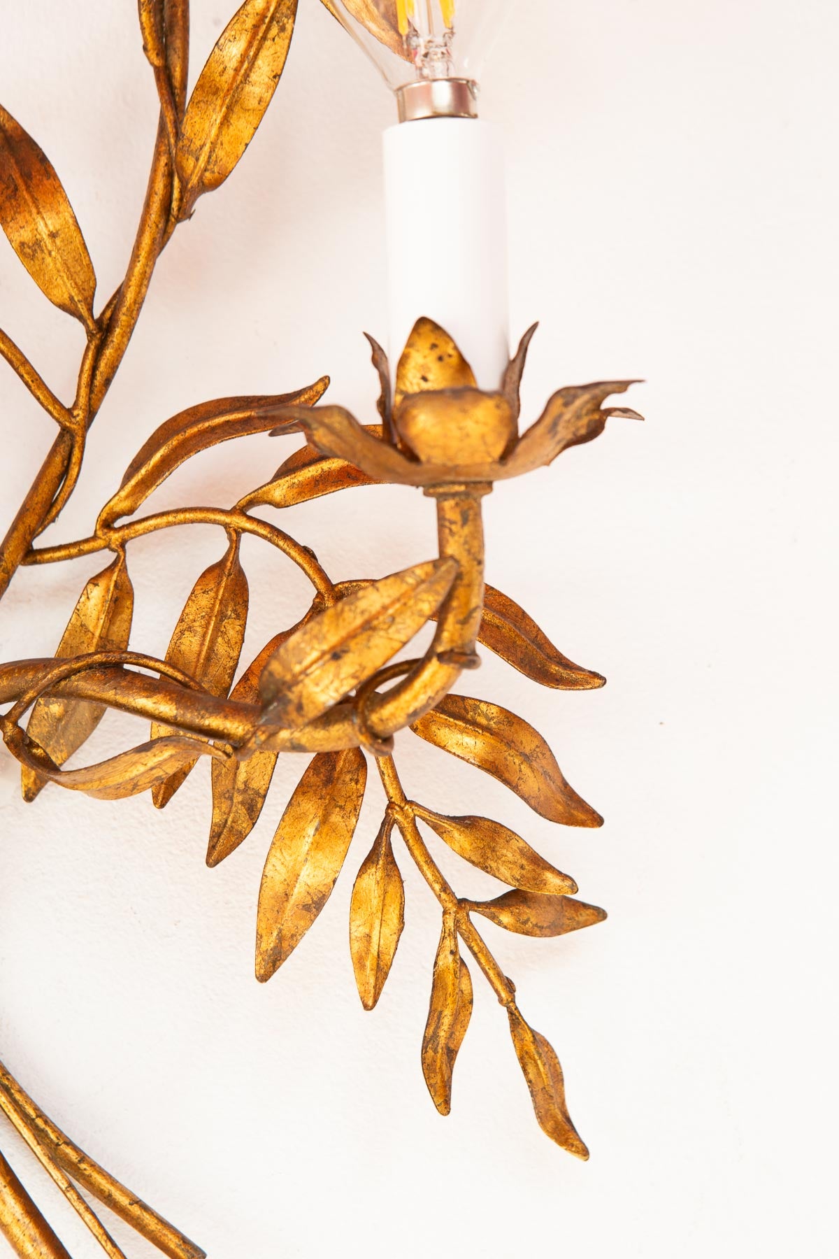 Gran aplique italiano de aprox. 1960/0 de metal dorado con un diseño de hojas y dos puntos de luz para dos bombillas tipo E14 (rosca fina). Conserva la chapa metálica con el Made in Italy habitual de la producción de la prestigiosa firma italiana de iluminación Banci.