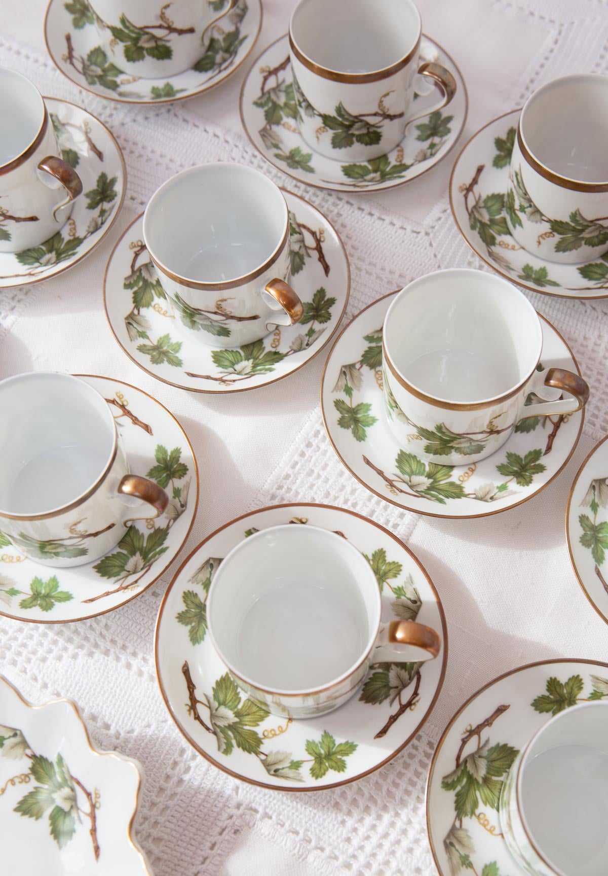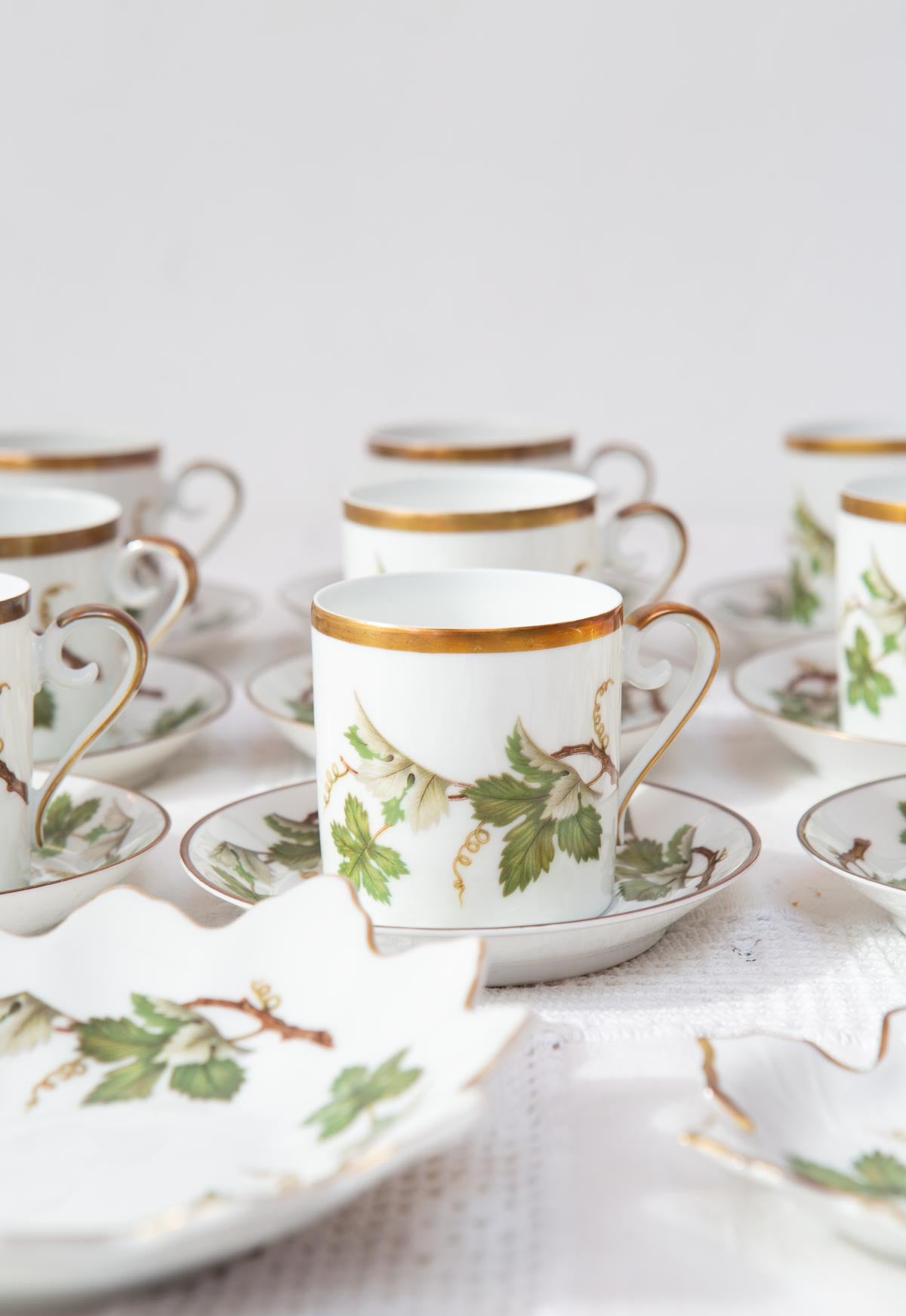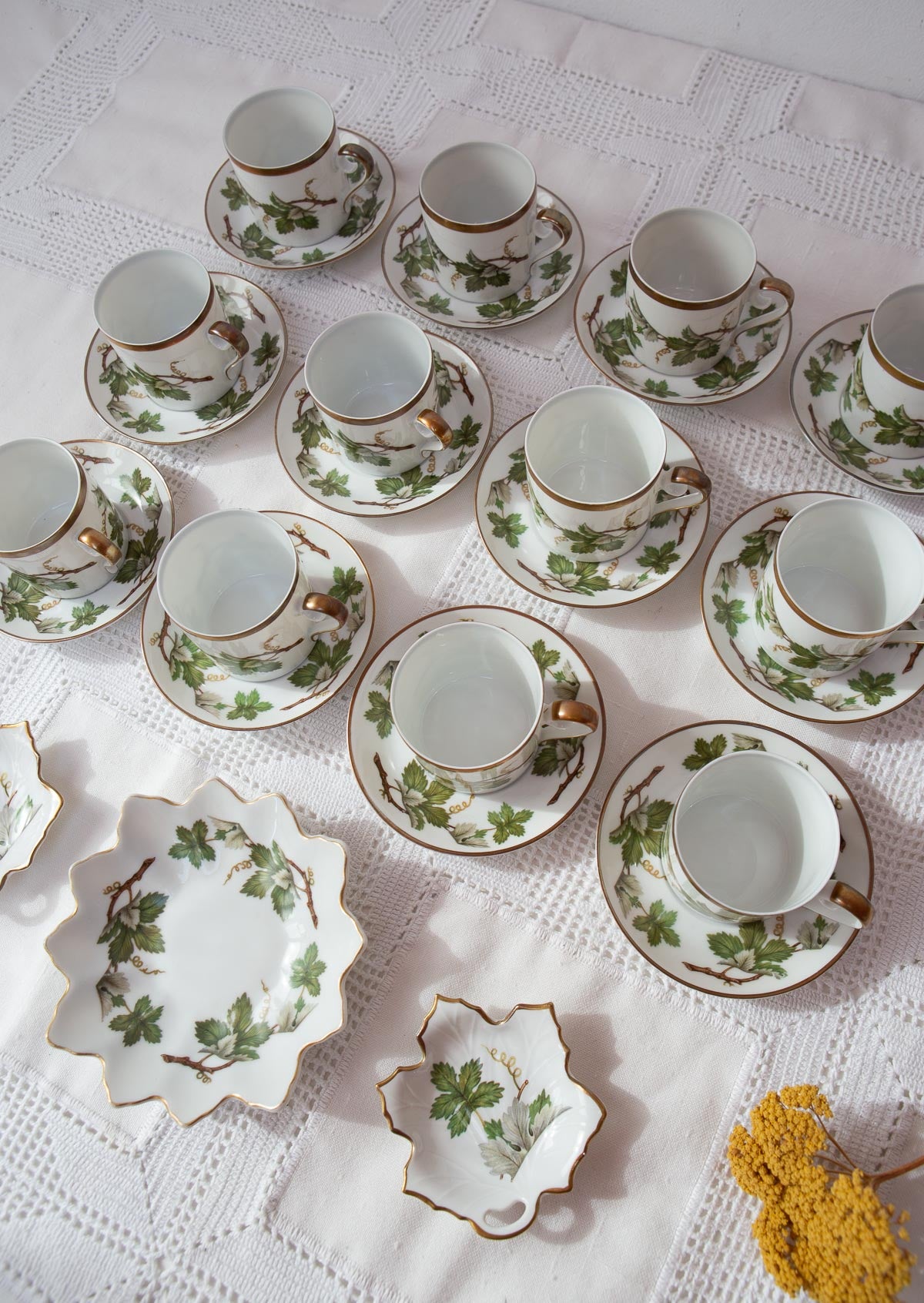 Juego de café para 12 en porcelana sueca de la prestigiosa firma Hackefors de su modelo "Vinranka", con su conocido diseño con hojas de parra. Aprox. 1970. Está posiblemente sin estrenar ya que tanto los motivos vegetales como los ribetes dorados no muestran desgaste.