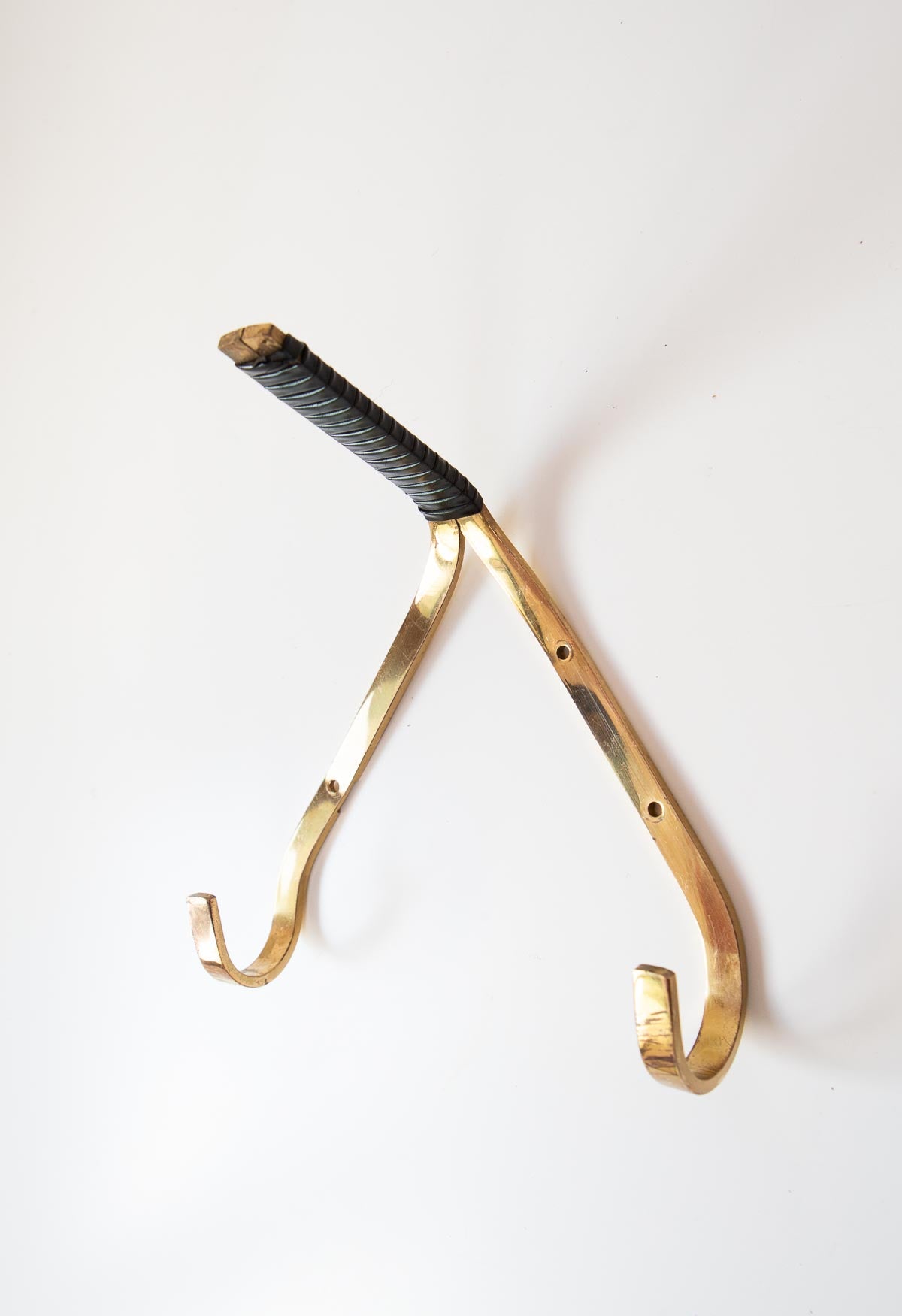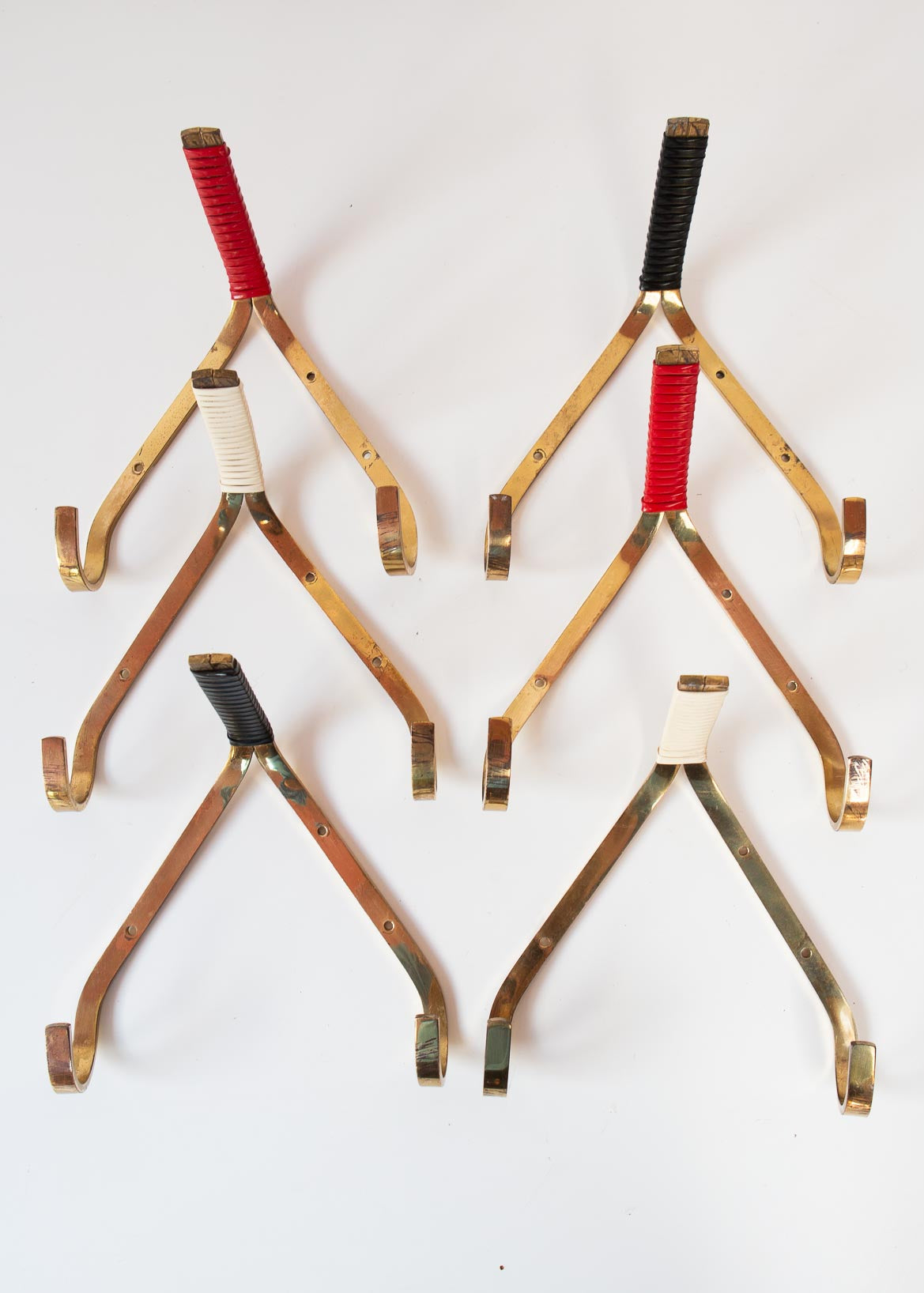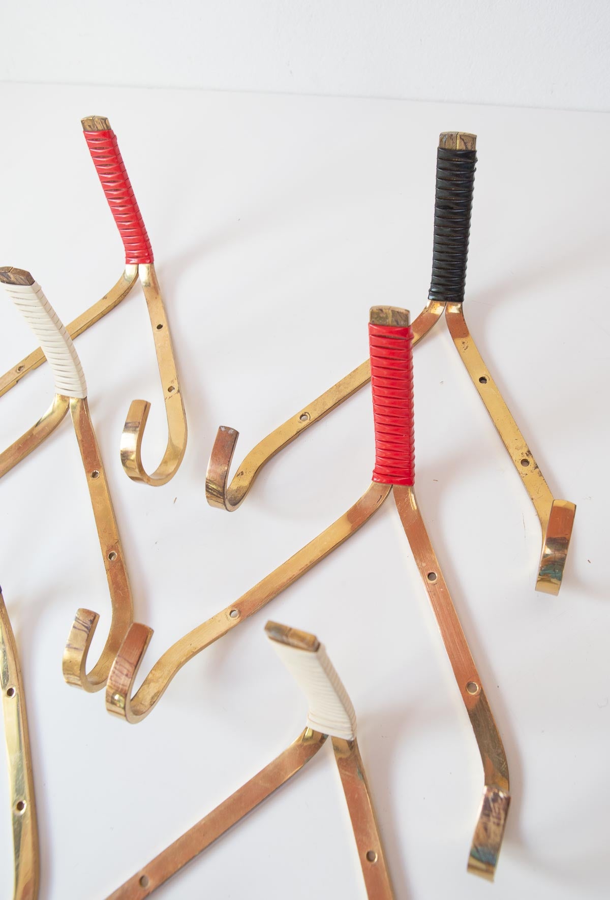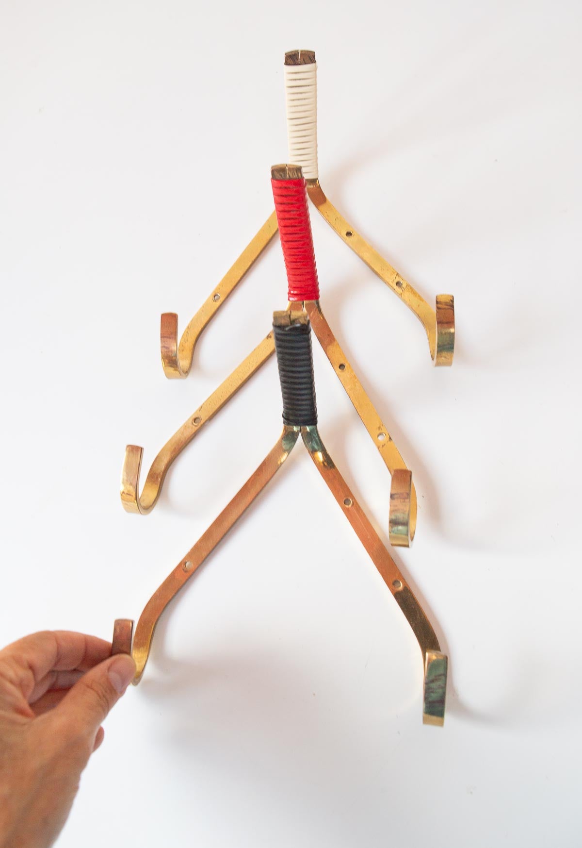 Small German wall coat racks from the 1950s with three hooks each. Made of golden brass that has developed a beautiful patina over the years, they feature a non-elastic rubber ribbon detail on the central tip in white, red, or black. Price per unit. Dimensions: H 18,5 cm, L 17 cm, D 10,5 cm. We ship worldwide. Shipping costs will be added at checkout for some destinations. Otherwise, contact us.