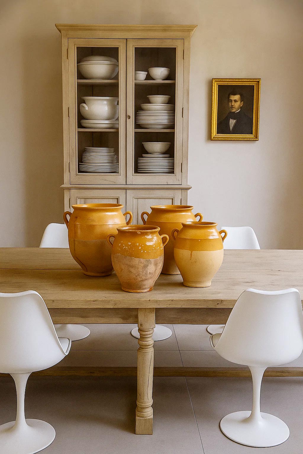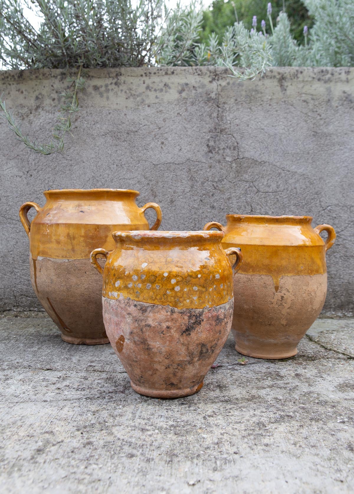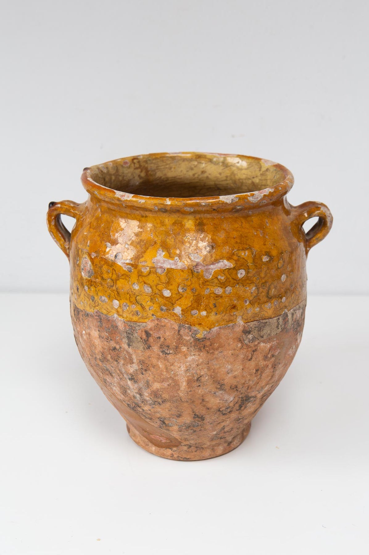 Antigua vasija en barro esmaltado para la preparación del confit de pato. Este tipo de vasijas son típicas del sur oeste francés por su esmalte de color amarillo-ocre. Es de la segunda mitad del s. XIX y una pieza decorativa fantástica que queda tan bien en una cocina como en un jardín o terraza.