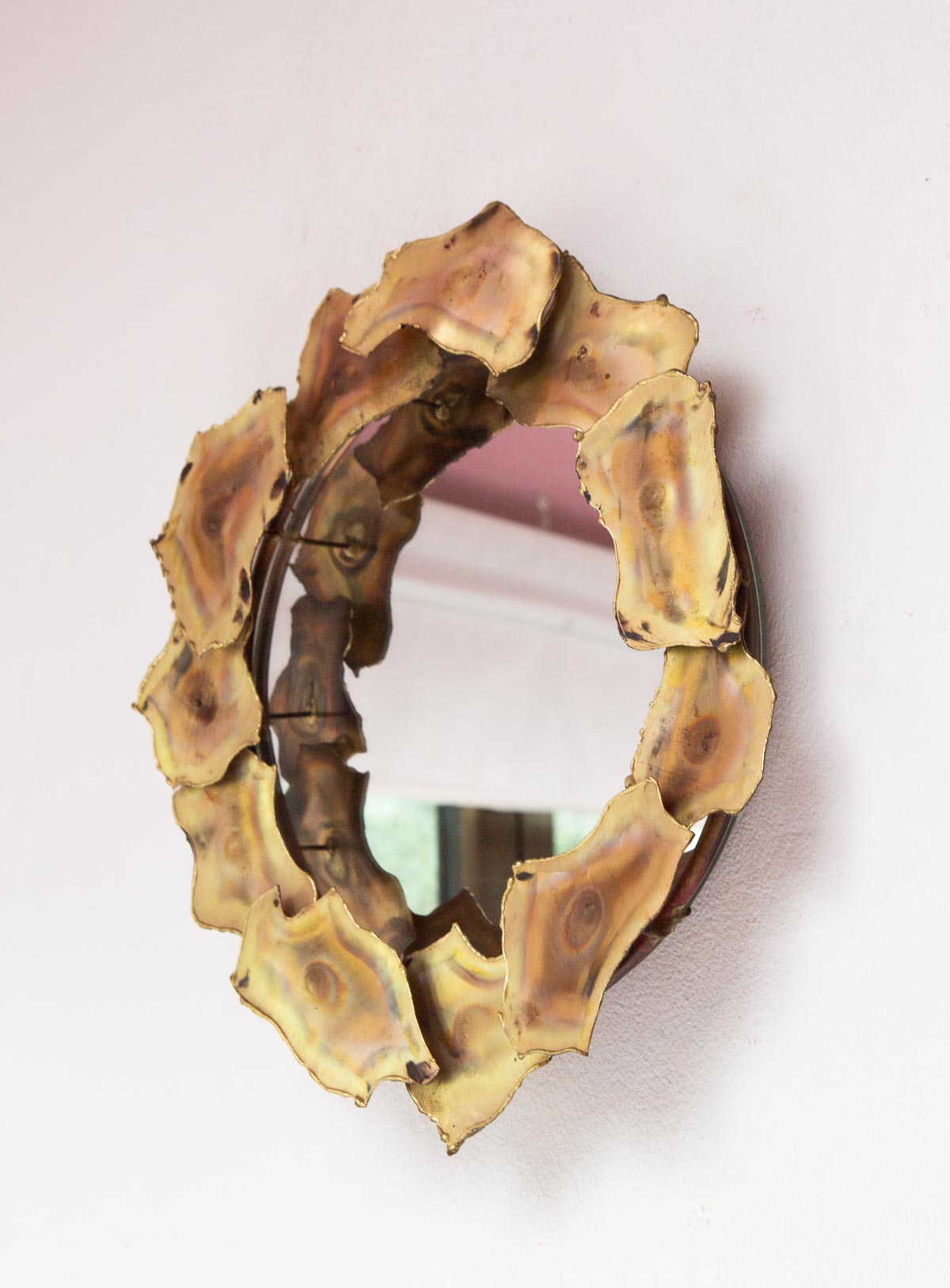 Más que un espejo tipo sol, es una escultura de pared creada de forma artesanal con láminas de latón soldadas sobre una estructura circular. Casi con total seguridad procedente de Estados Unidos y de aprox. 1970. Está perfecta.