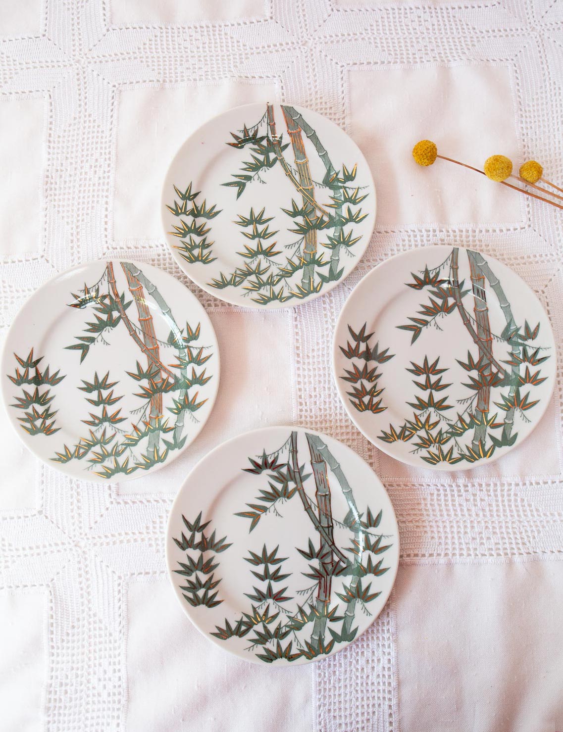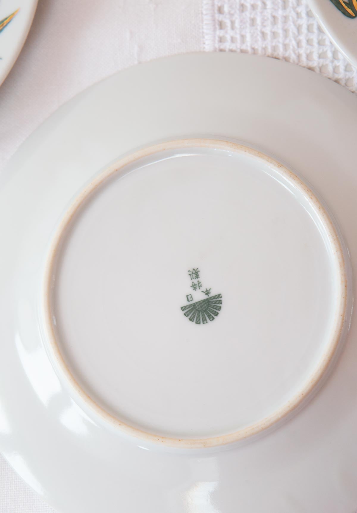 Juego de 4 platos para postre de porcelana china con un precioso diseño de palmeras en tonos verde y dorado. Desconocemos edad, pero están impecables.