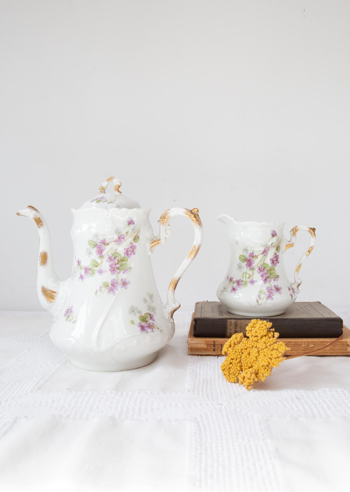 Delicate and elegant French Limoges porcelain coffee set, decorated with a motif of violets and fine gilt details. The pieces feature a sinuous, Rococo-inspired shape, with finely moulded handles and spouts highlighted in gold. This set stands out for the exceptional quality of its porcelain and for the softness and freshness of its floral decoration, characteristic of the Belle Époque period.. Dimensions: see description in Spanish. Shipping costs will be added at checkout.