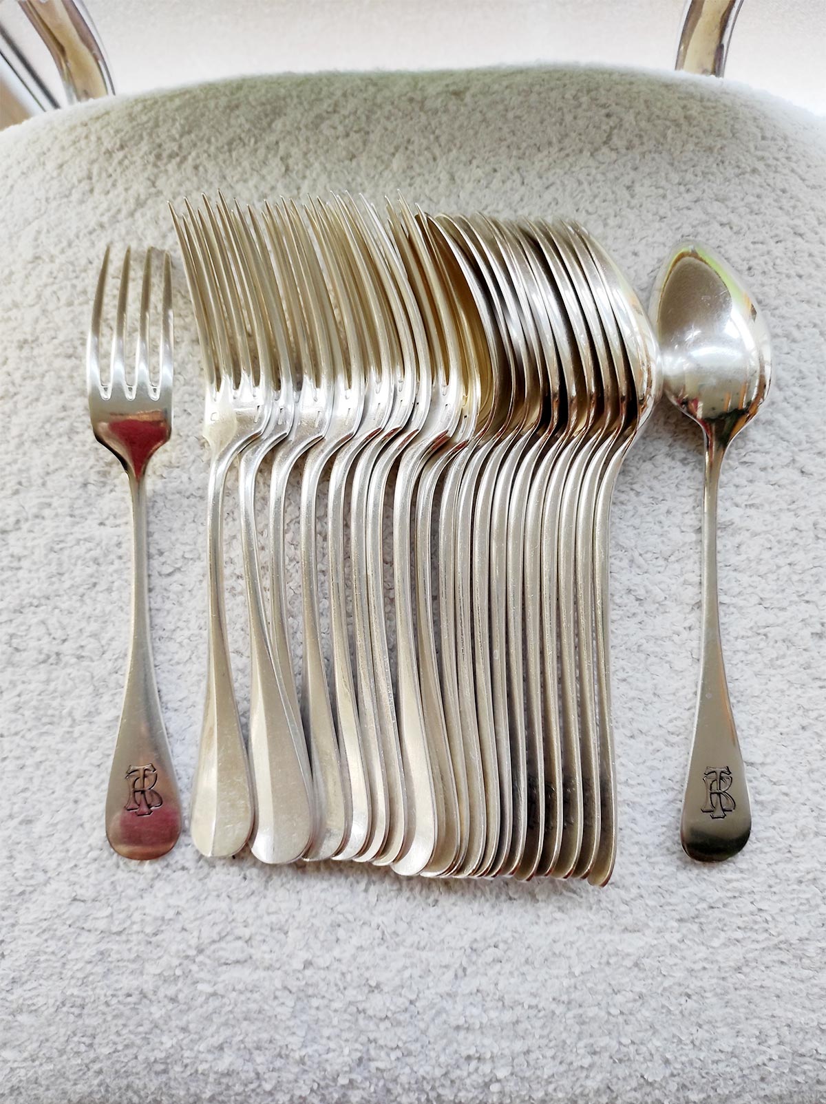 Juego de antiguos cubiertos franceses de la prestigiosa firma Christofle casi con total seguridad de la segunda mitad del s. XIX. Metal con baño de plata 84. Todos los cubiertos llevan grabados las iniciales T.B o B.T. y están en un estado espectacular para sus años sin faltas en el baño. El juego está formado por 12 cucharas y 12 tenedores de mesa. Como ves en la última foto, los cuños corresponden a la producción de la segunda mitad del s. XIX.