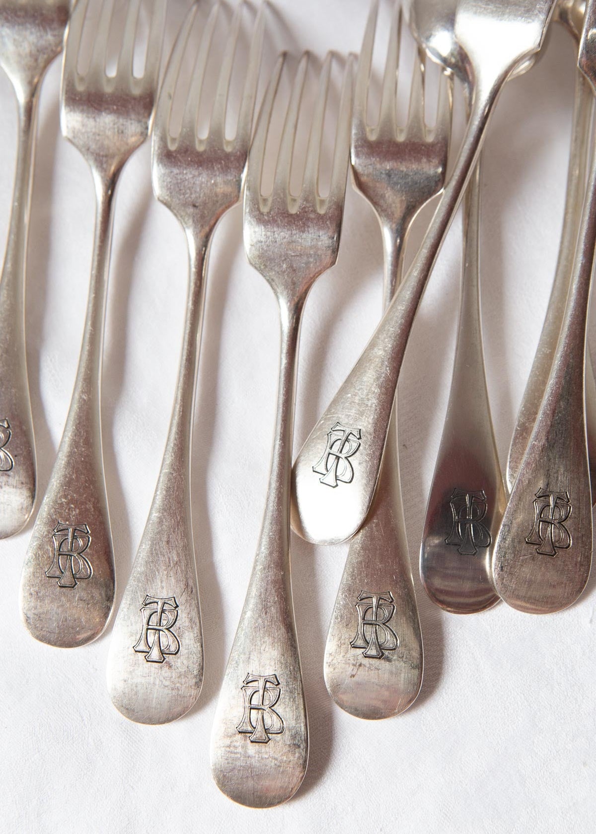 Set of antique French flatware by the prestigious Christofle firm, almost certainly dating from the second half of the 19th century. The pieces are crafted from silverplated metal, standardized as '84' (referencing the amount of silver used for the plating). All pieces are finely engraved with the interlaced initials T.B. or B.T. and remain in spectacular condition for their age. The set consists of 12 table spoons and 12 table forks. As shown in the final photograph, the hallmarks confirm production from the second half of the 19th century. Dimensions: 21 cm (79, 85 grams/u.). We ship worldwide but shipping costs are not included in the price. Contact us for details.
