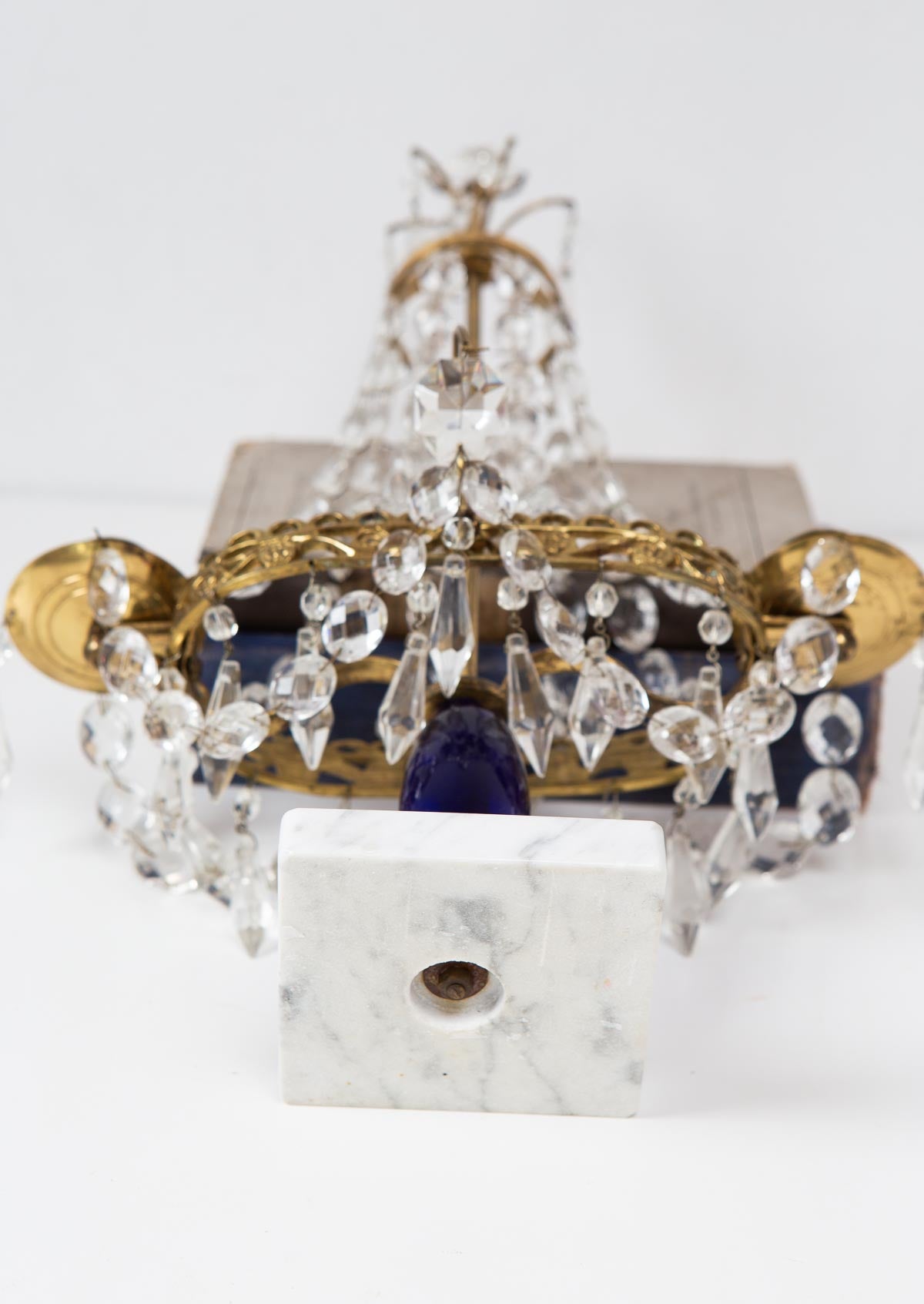 Candelabro de sobremesa sueco, en estilo gustaviano y de la segunda mitad del s. XX c. 1970s. Es una pieza de calidad, realizada con latón, cristal azul, mármol blanco y cadenas de cristales incoloros. Perfecto como centro de mesa o con un par de velas de colores sobre una pila de libros o revistas para crear un rincón decorativo lleno de personalidad.