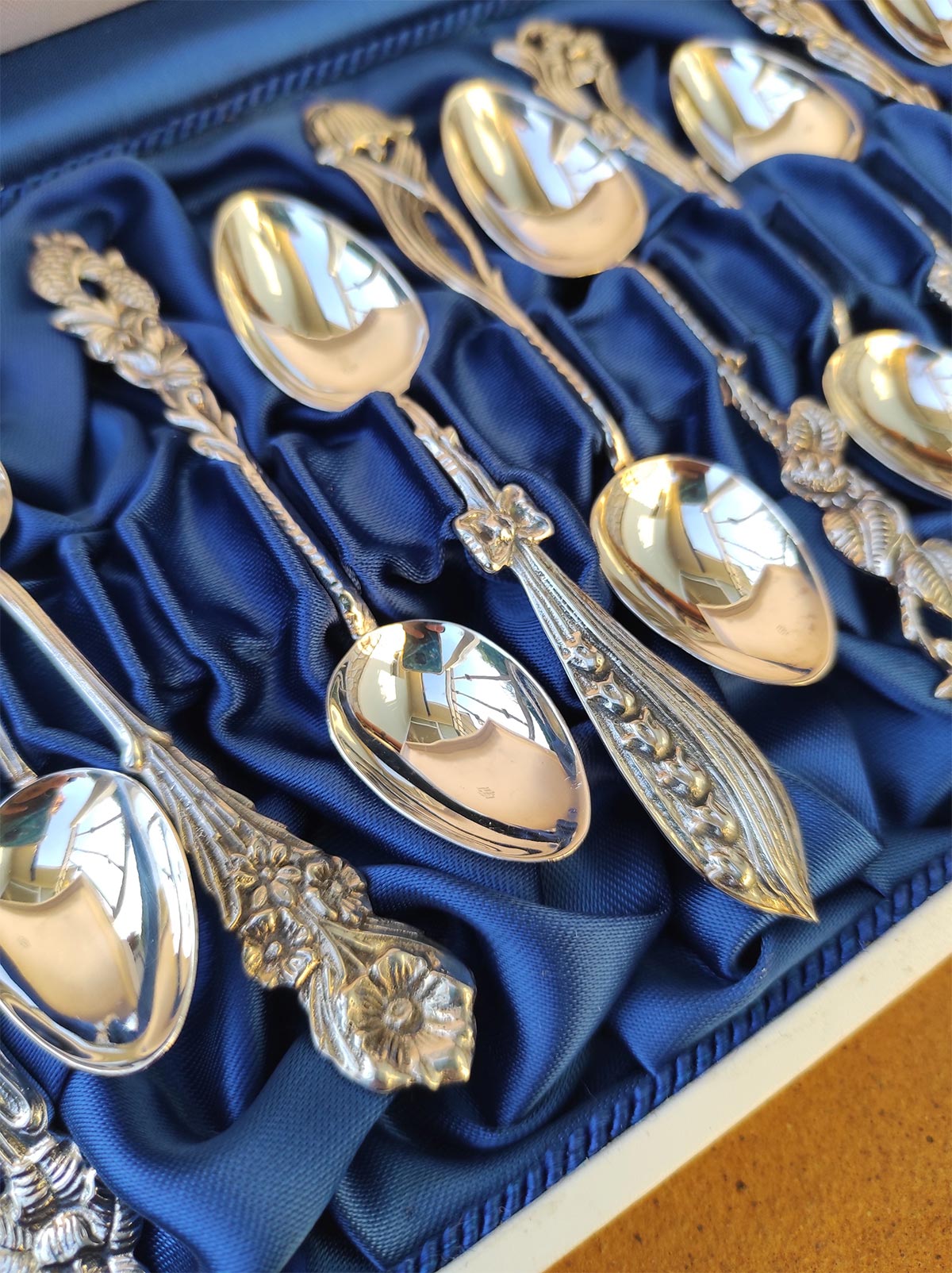 Service complet de 12 cuillères à café en argent massif suédoises, modèle « Svenska Floran » (La flore suédoise), fabriqué par GEWE Silvervarufabriken AB.