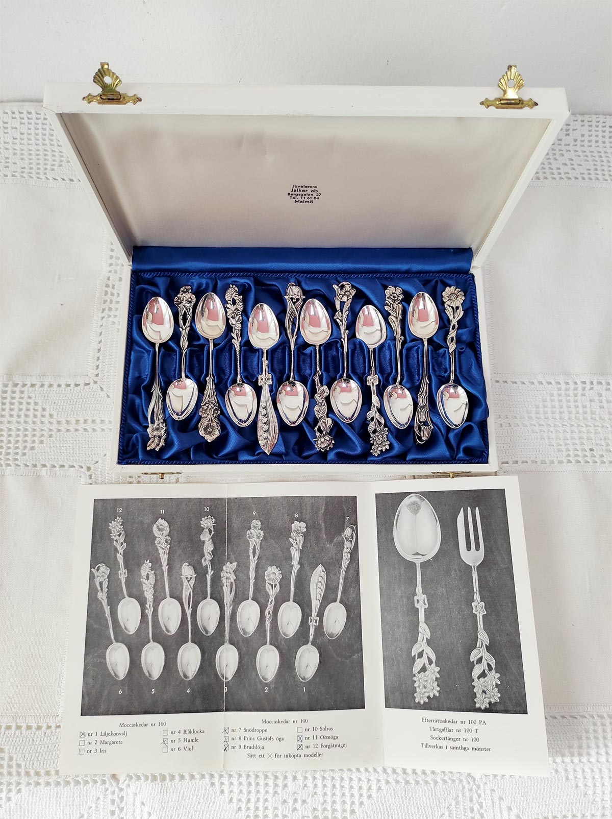Complete set of 12 solid silver Swedish coffee spoons, model "Svenska Floran" (The Swedish Flora), made by GEWE Silvervarufabriken AB. Each spoon features a unique handle design inspired by iconic Swedish flowers and plants, such as lily of the valley (Liljekonvalj), daisy (Margareta), iris (Iris), violet (Viol), among others.