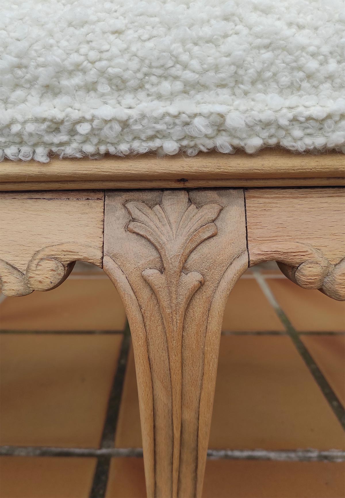 Antique bench in the Louis XV style, crafted from chestnut wood with delicate carvings on the legs and apron. The structure has been sandblasted to achieve a rough, natural, and beautifully worn finish that highlights the character of the chestnut grain and gives the piece an authentic, organic feel. The seat has been professionally reupholstered with a high-quality off-white bouclé fabric, soft and textured, bringing warmth and a refined, contemporary look. Dimensions: 108*46*48 cm. We ship worldwide. Shipping costs are not included. Contact us to have a shipping quote.