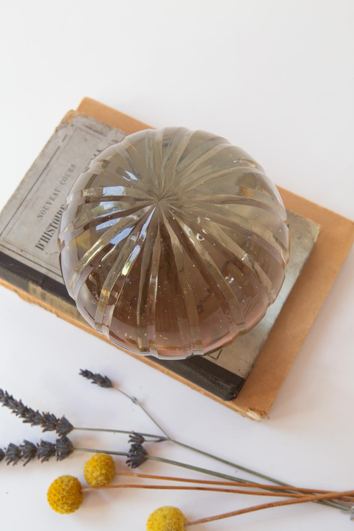 Gran pisapapeles de cristal con forma esférica de la segunda mitad del s. XX. Pesa más de dos kilos. Nos encanta el tono amarillo pálido del cristal y el diseño en forma de estrella tallado en el cristal. Desconocemos su origen ya que no va firmados en la base.