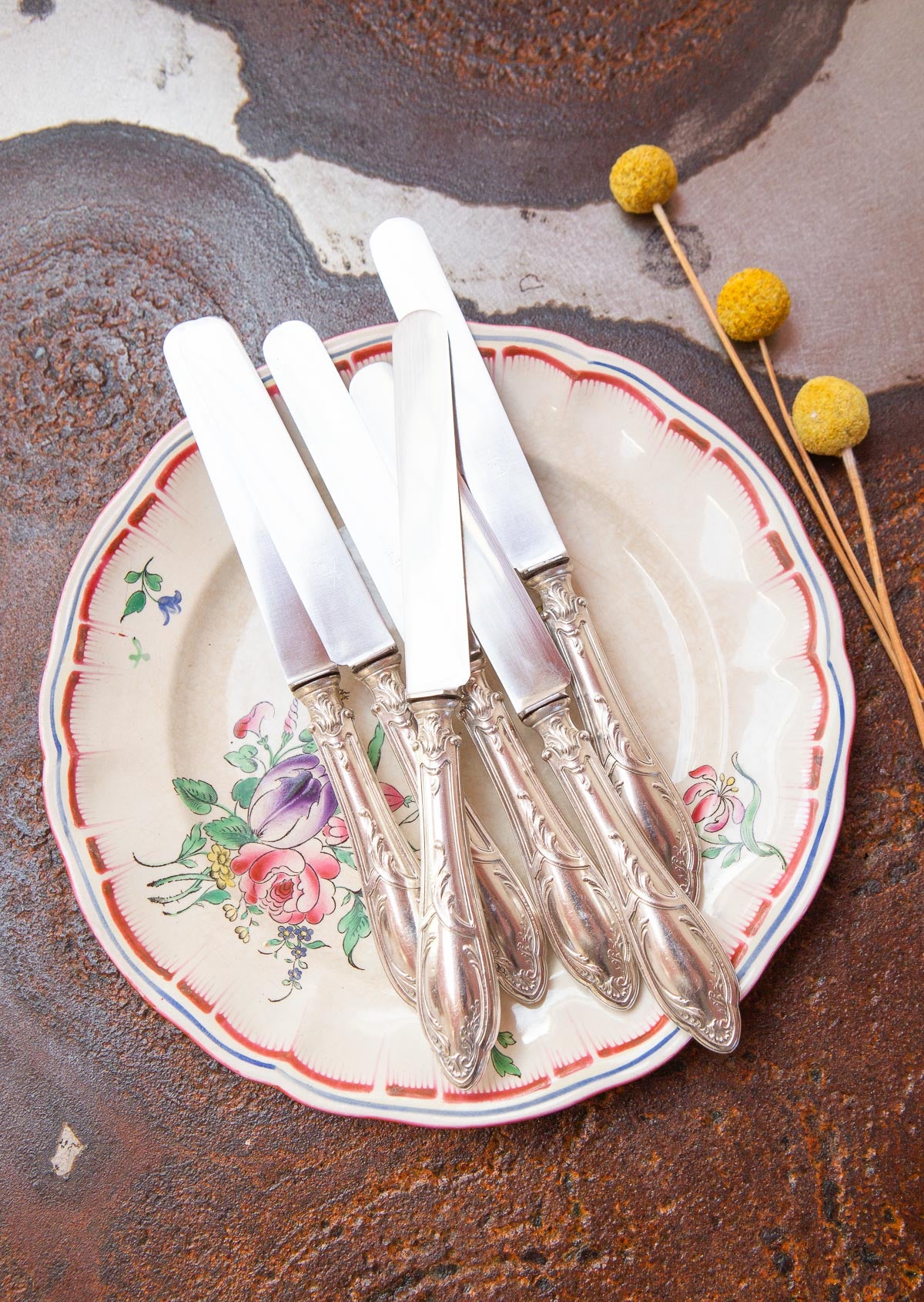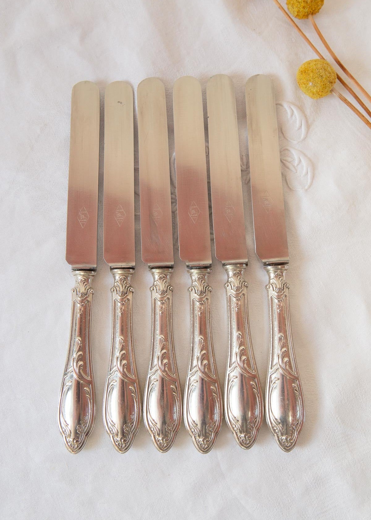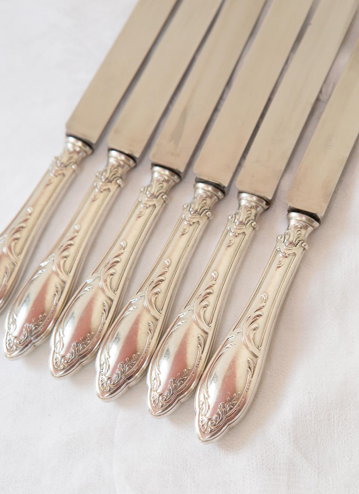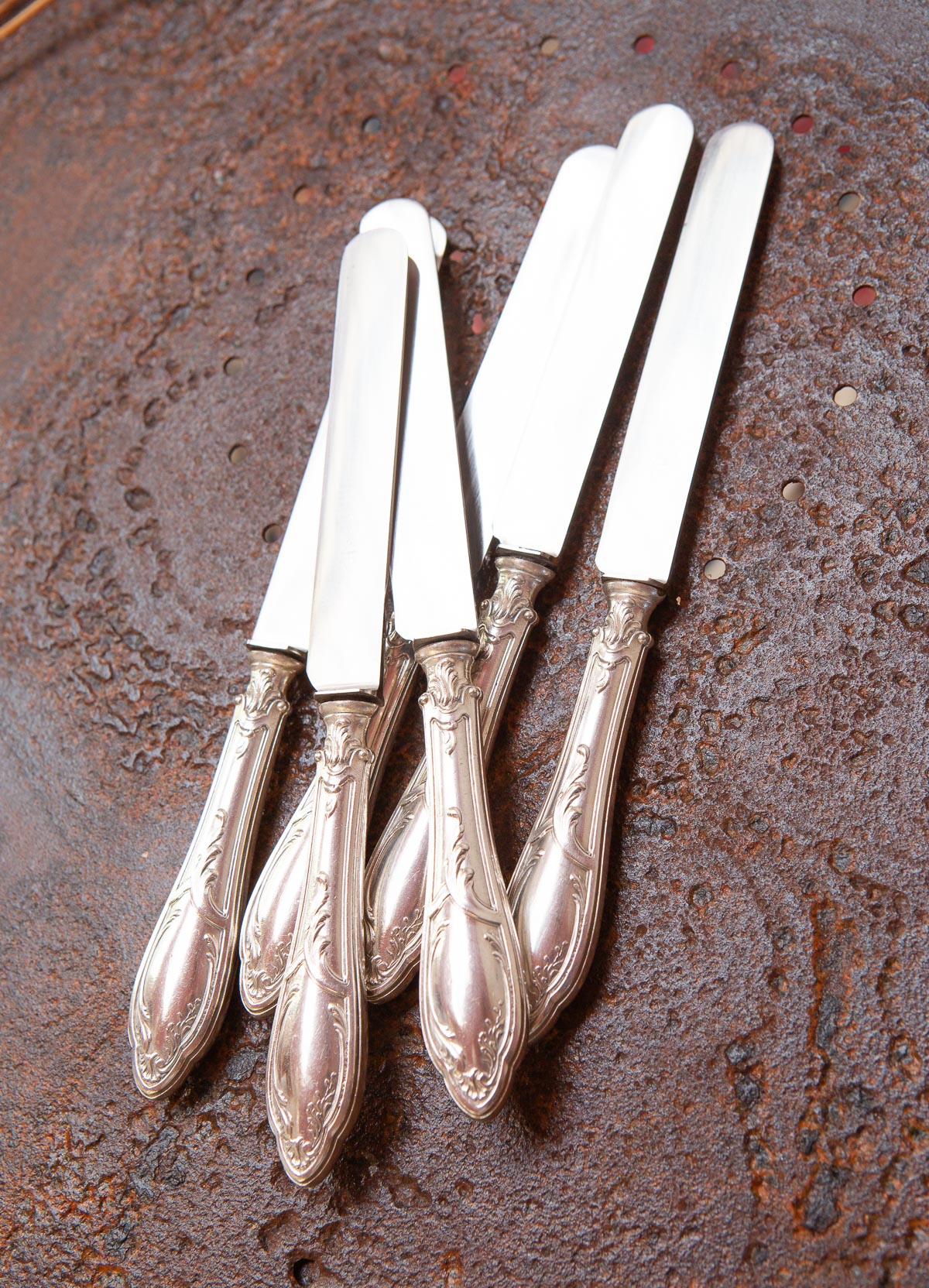 Juego 6 cuchillos franceses antiguos metal baño plata estilo Louis XV