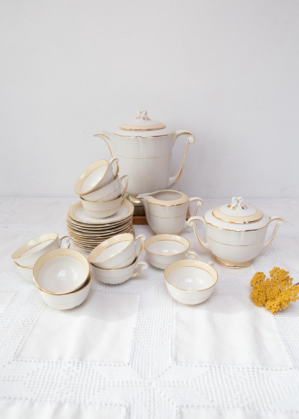 Juego de té o café para 11 personas en loza francesa de aprox. 1960s. Todas las piezas están perfectas y con poco uso salvo una mínima muesca en el borde de la lechera (ver última foto).