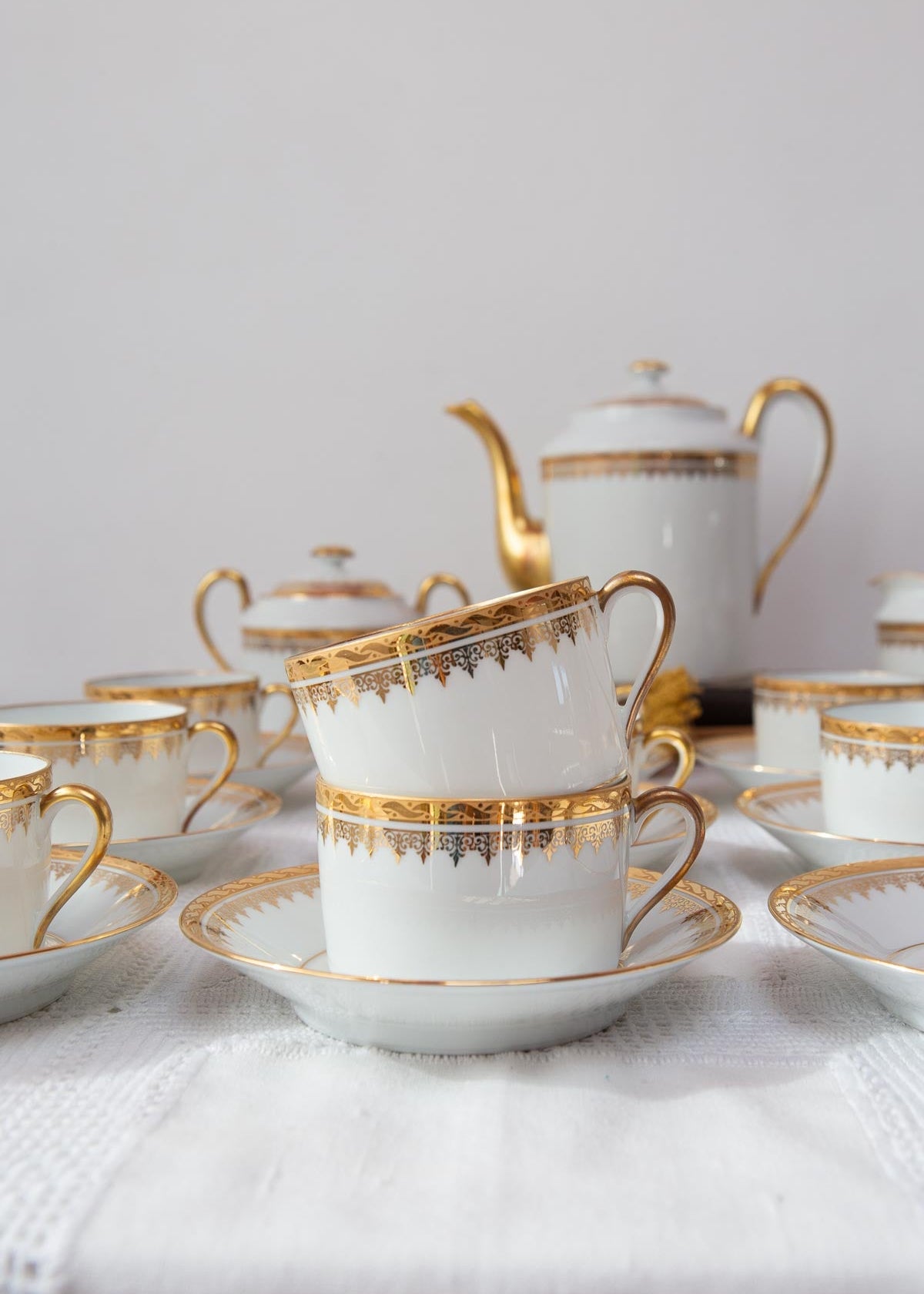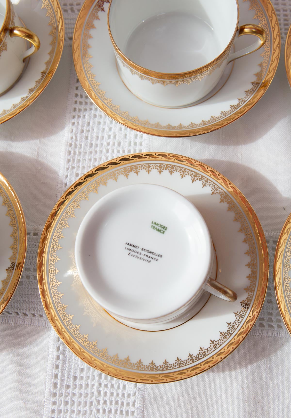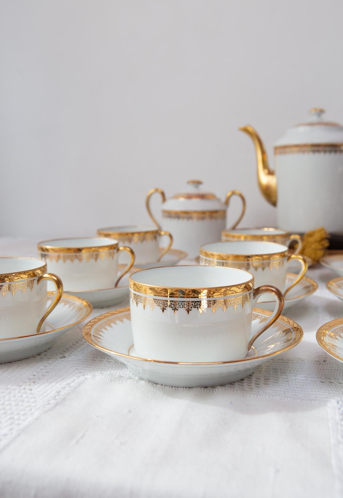 Espectacular juego de té francés, de la más fina porcelana Limoges firmada Jammet Seignoles, con detalles en dorado y de la década de 1960 posiblemente.