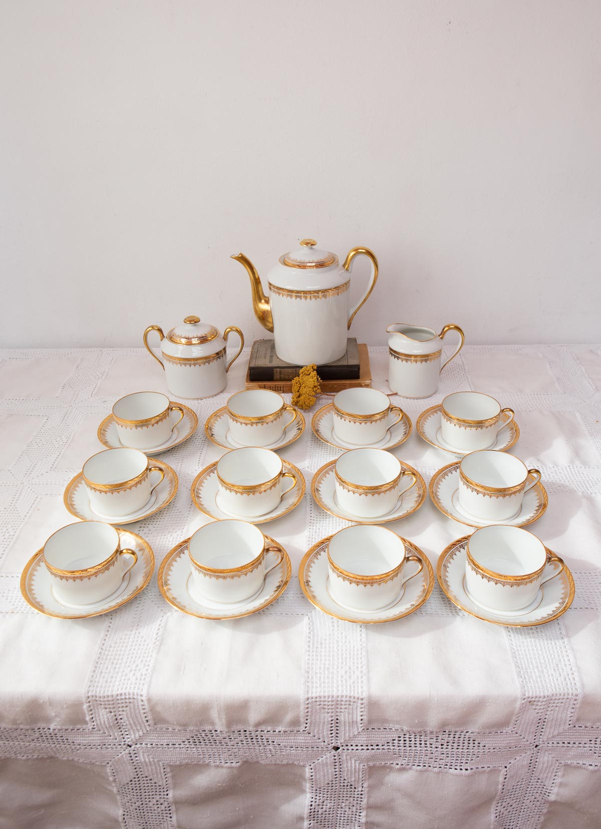 Vintage French tea service for 12. Limoges porcelain by Jammet Seignoles c. 1960s. No chips or cracks. 27 pieces. Really good condition, probably never used. Dimensions: see Spanish description. We ship worldwide.