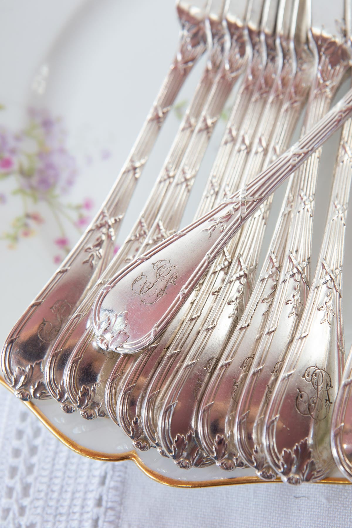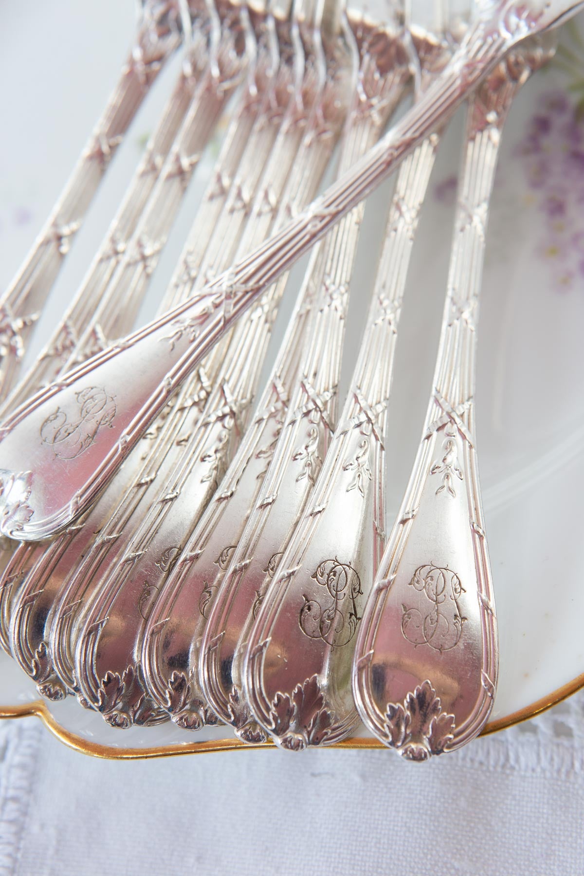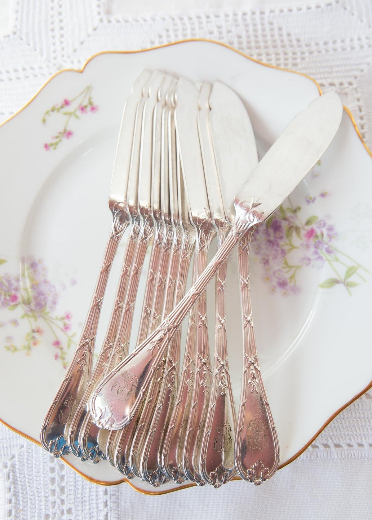 Juego de 12 palas de pescado francesas de la prestigiosa firma Christofle de aprox. 1910 (anteriores en todo caso a 1926 al carecer de la marca indicando los gramos de plata usados en su baño, obligatorio a partir de esa fecha). Son casi idénticos al modelo Rubans que aún sigue en el catálogo de Christofle. Todos los cubiertos llevan las iniciales J.P. grabadas en los mangos, lo que les da un encanto muy especial. RESERVADAS