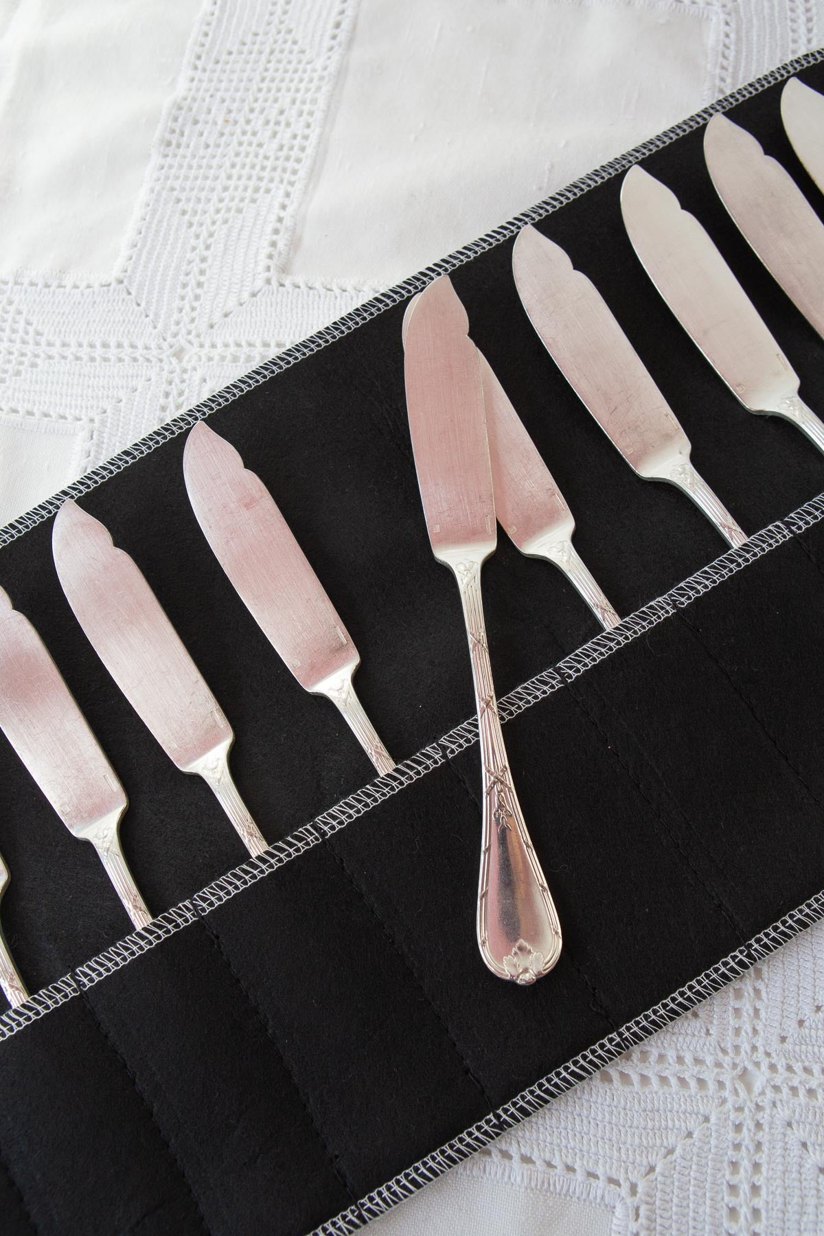 Set of 12 fish knives set by Christofle c. 1910. Initials J. P. Dimensions: 22 cm. We ship worldwide but shipping costs are not included in the price. Contact us for details.