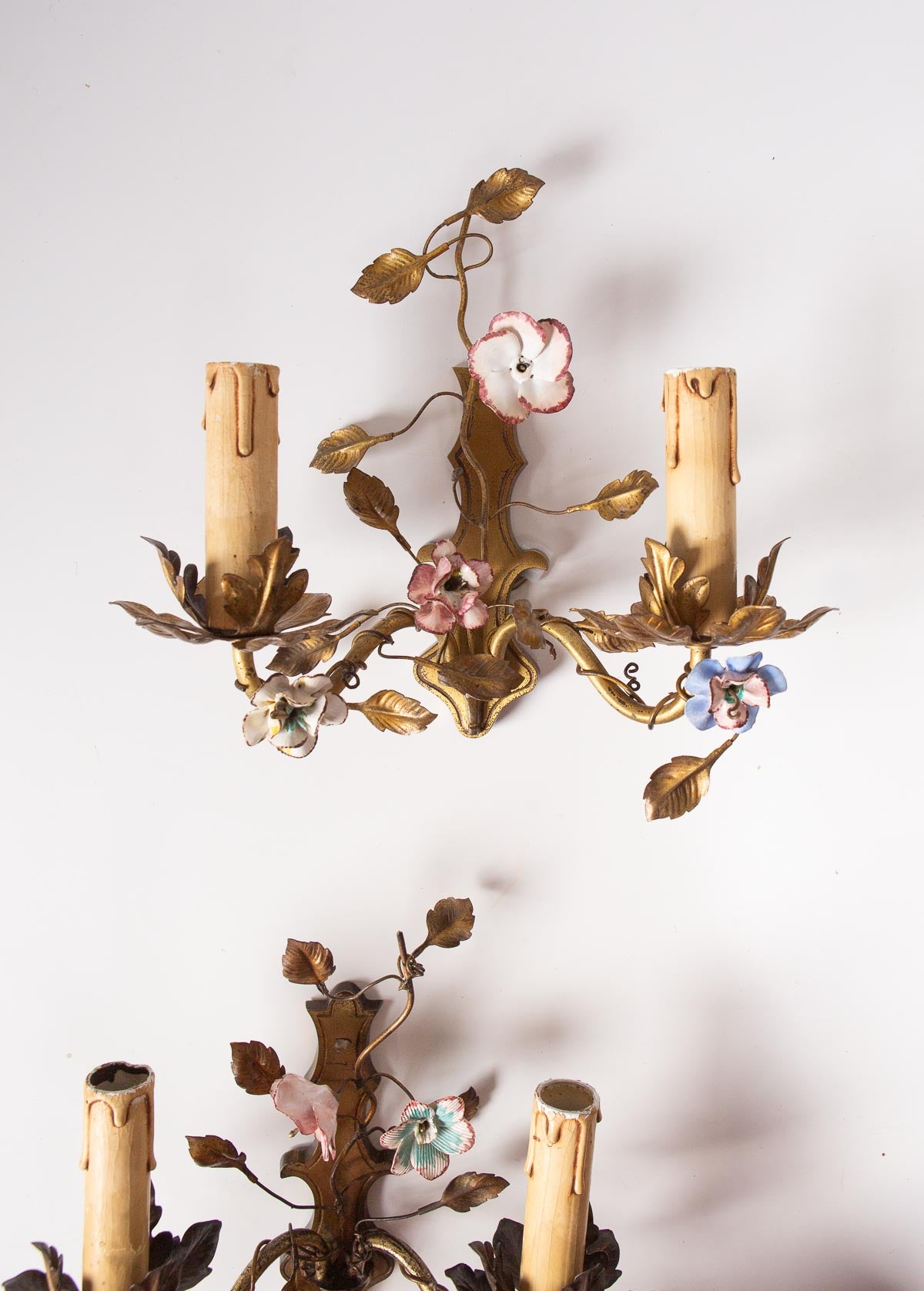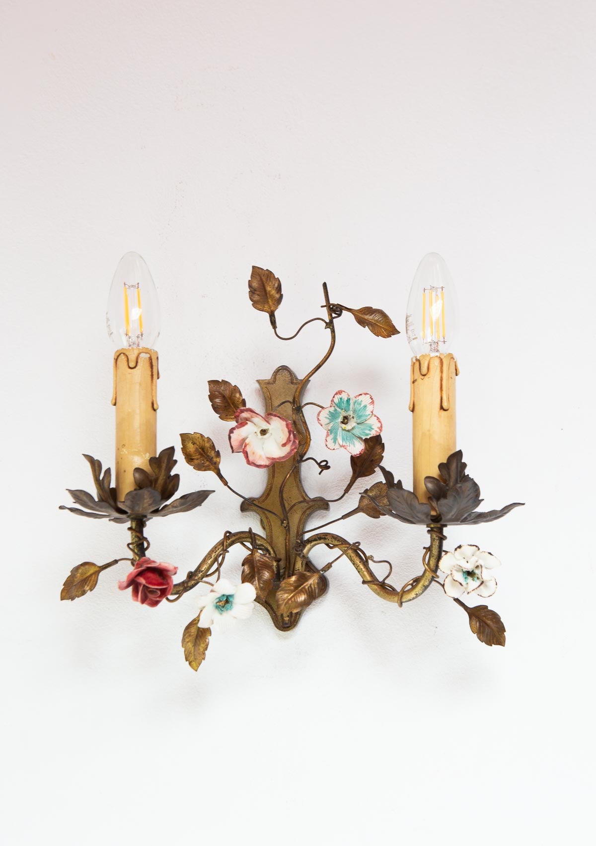 Pareja de antiguos apliques franceses de latón con flores de porcelana pintada en colores. Son un espectáculo y conservan la mayoría de las flores. Aprox. 1950-60s. Ideales para colocar a ambos lados de un espejo en un baño o aseo, en un pasillo, sobre las mesillas de noche. Aportan un toque romántico y personal a cualquier espacio.