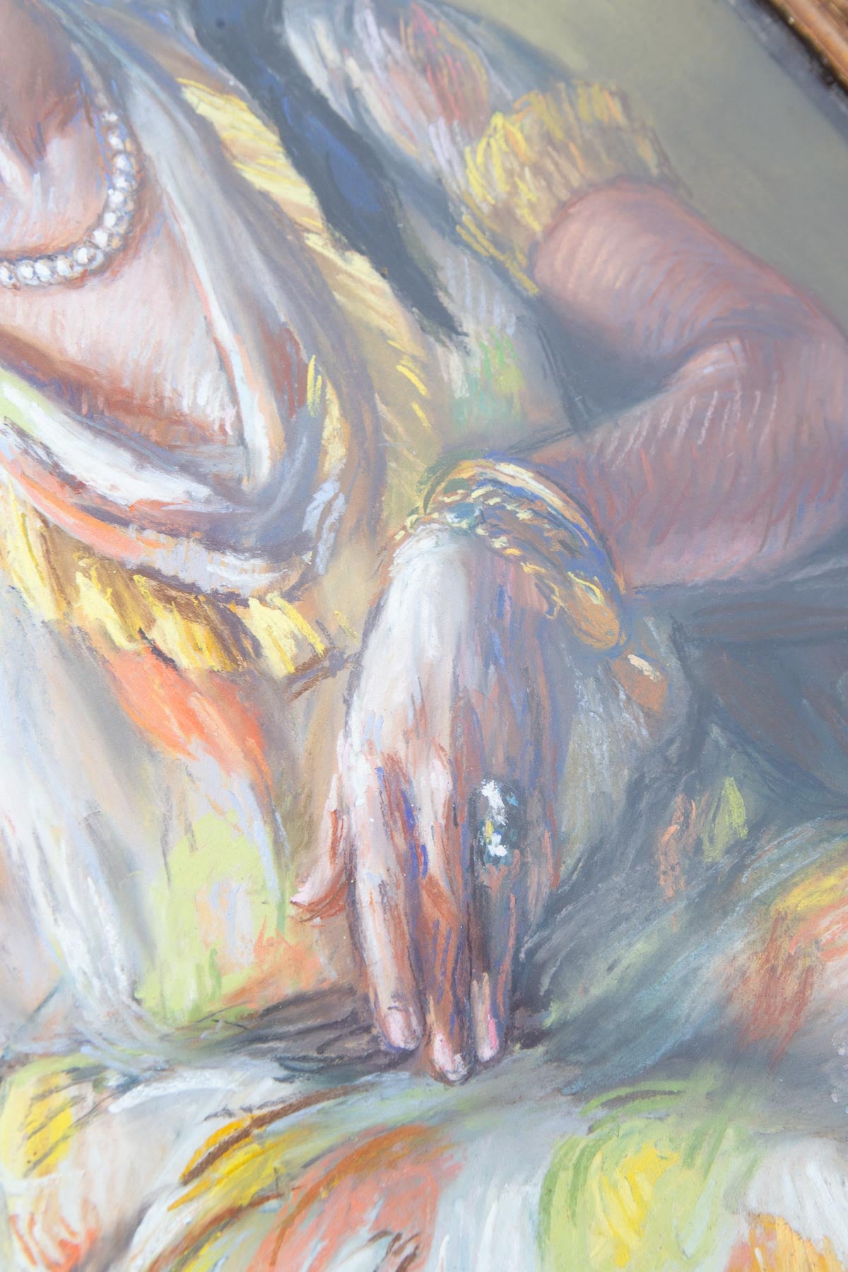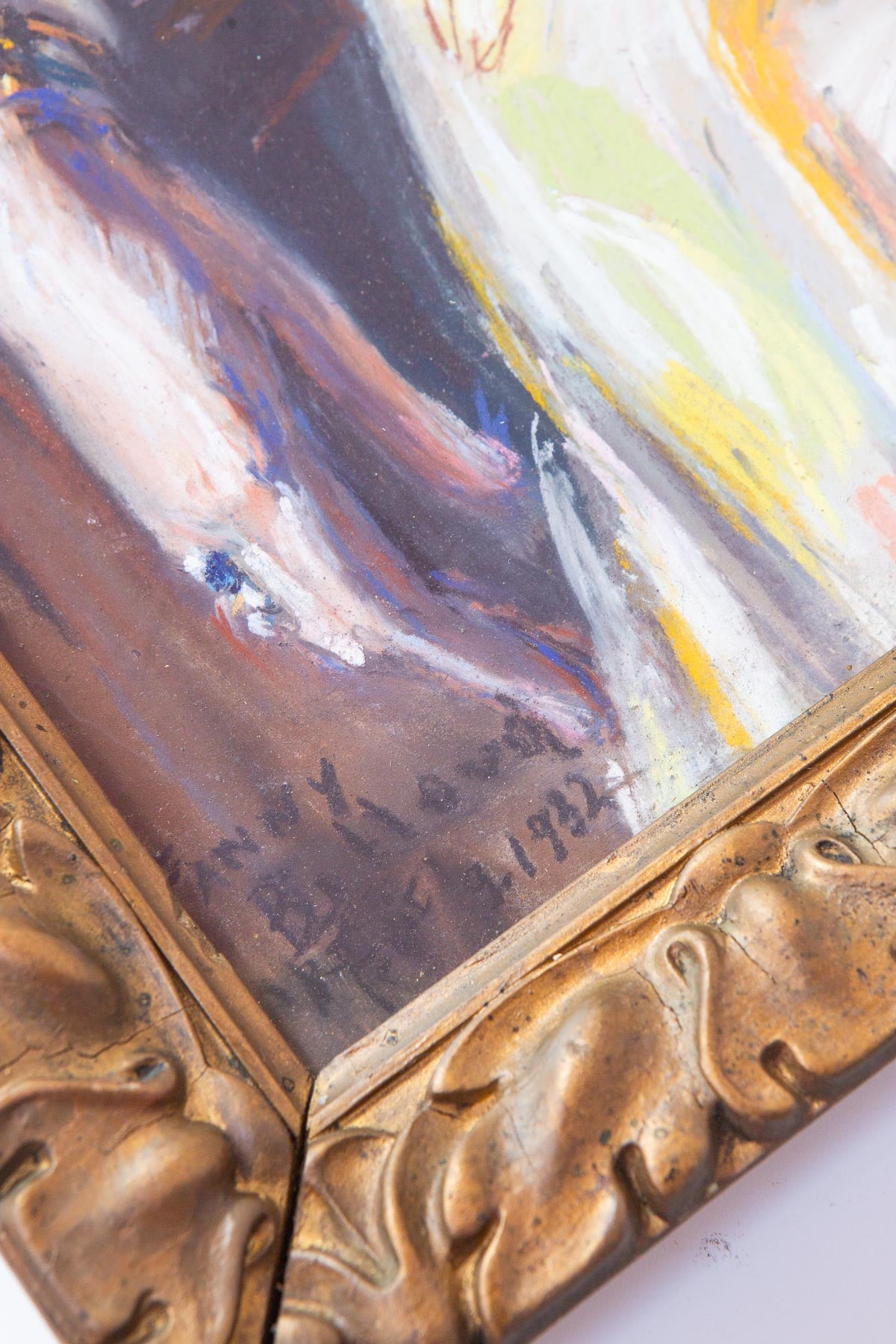 La obra conserva su marco original de madera dorada en tono cobrizo oscuro, con algunas restauraciones. Mantiene también su cristal soplado original. En la parte inferior del pastel se aprecian restos de humedad que se confunden en gran parte con las pinceladas de la artista, pero ahí están. Hemos tenido buena cuenta en el precio